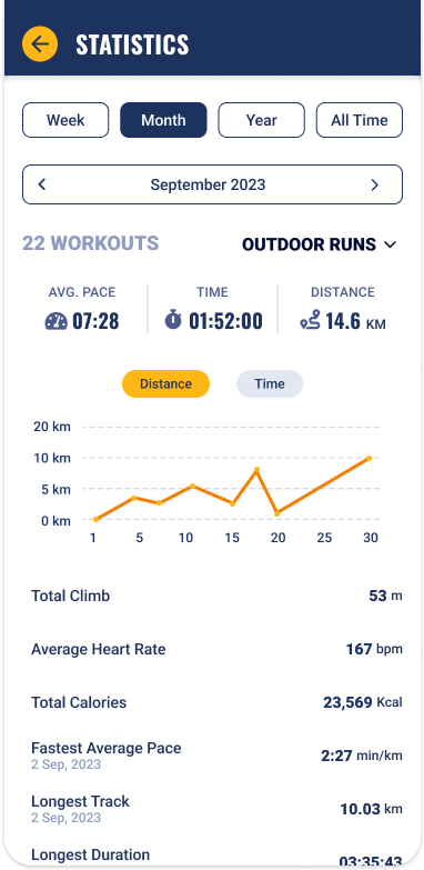 Track your progress; pace, splits, location, distance & elevation. Get insights on your performance and learn where you can perform better.