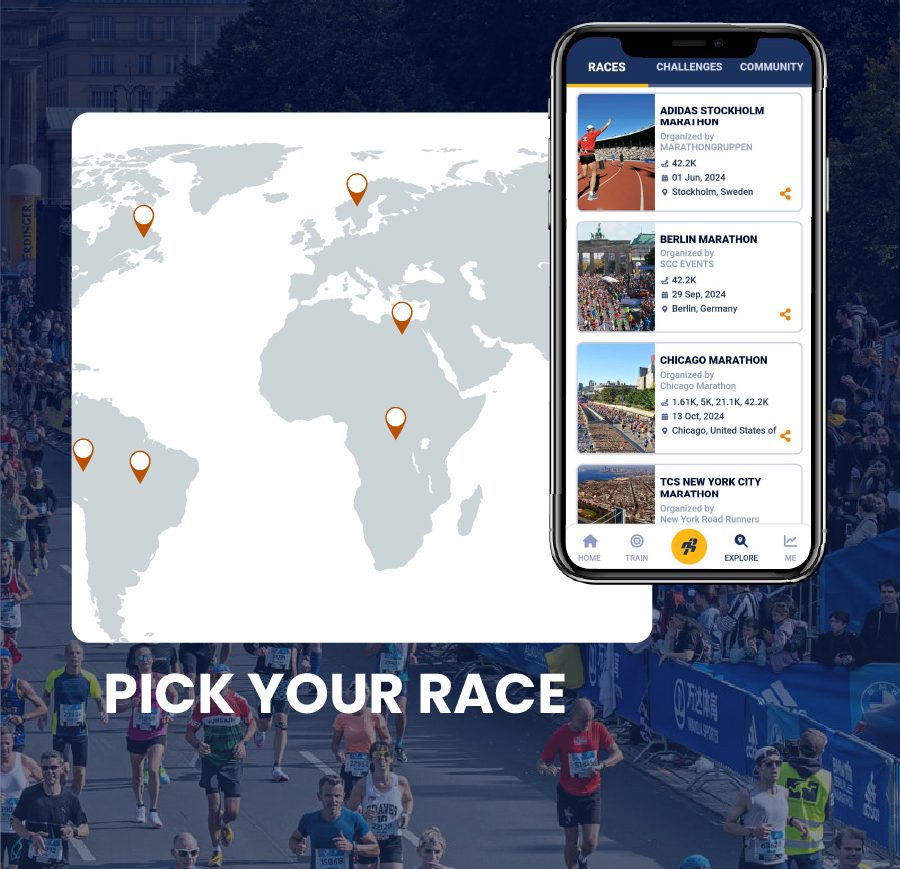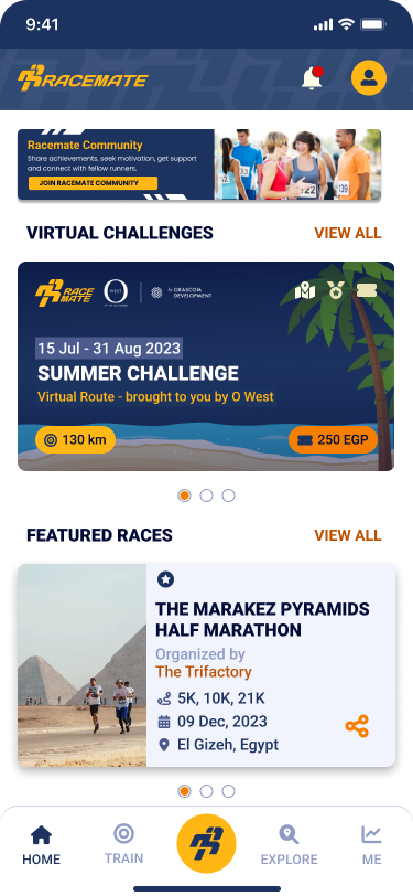 Select your affiliated race, virtual challenge or community run and get Racemate ready. All your events and performances are gathered in one place. We got you!
